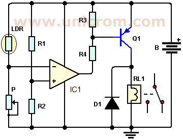 Hey todo el mundo, voy a hacer un sensor de luz/oscuro con un opamp lm741. Detector de oscuridad ldr ne555 proyecto. Cuando hay suficiente luz el transistor se satura, el relé se activa y el motor nota: Con el potenciómetro se ajusta la intensidad de la base que activa el par darlington. A continuación una pequeña explicación de algunos componentes:
