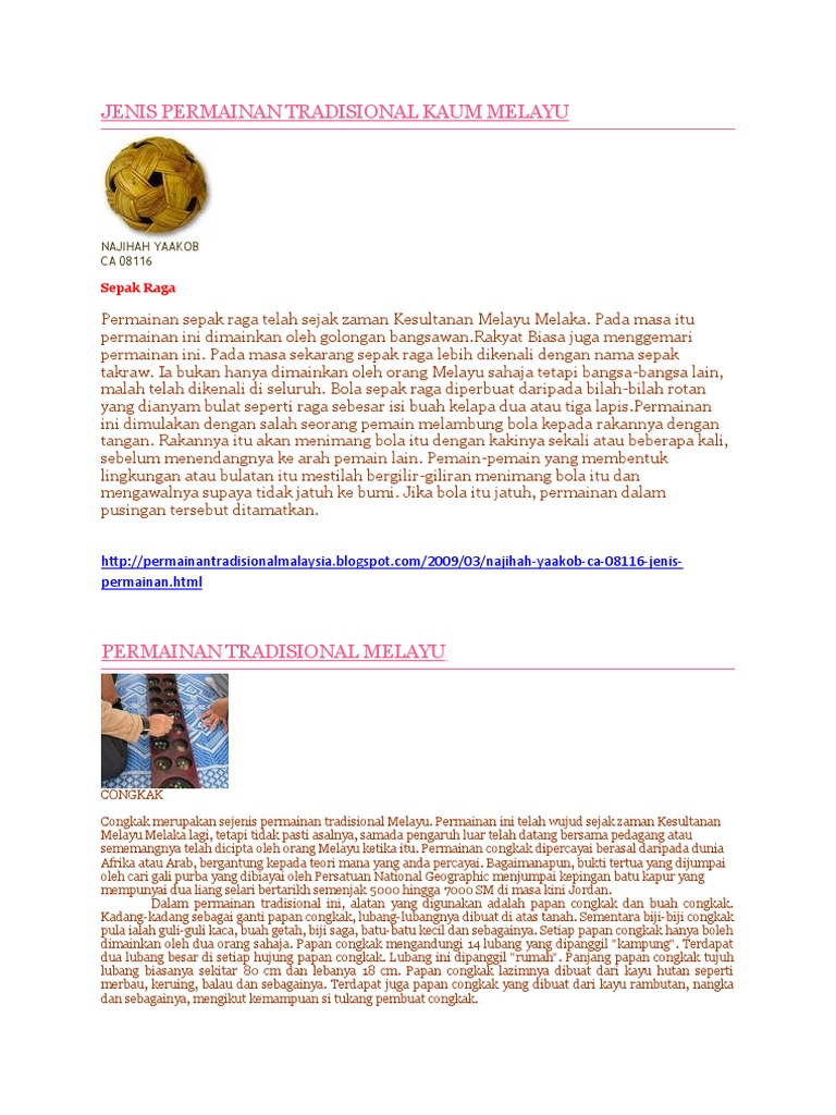 March 20, 2016march 30, 2016 / permainantradisionalrakyat. Lazimnya apabila pelepah ini tua, ia akan luruh atau jatuh ke tanah. Permainan tradisional kaum melayu www picswe com sumber : Permainan yang berasal dari maharashtra ni pada mulanya dimainkan menggunakan kereta kuda. Pakaian tradisional baju kebaya ini dikatakan berasal daripada kaum cina yang datang ke tanah melayu suatu ketika dahulu. Permainan ini memerlukan dua orang pemain.alatan yang digunakan dalam permainan ini adalah papan congkak dan buah congkak. Permainan tradisional kaum india kabaddi permainan kabaddi merupakan permainan tradisional yang berasal dari negara india. Pada zaman kerajaan melayu melakalah proses evolusi pakaian orang melayu ini mengapai tahap tertinggi. Jurnal permainan tradosional sumber : Kaum adam mula memakai baju melayu manakala kaum hawa mula memakai baju kurung dengan kelubung untuk menutup kepala. Banyak faedah yang boleh diperolehi daripada permainan tradisional seperti boleh mengeratkan silaturahim sesama manusia, menyihatkan badan dan dapat memelihara warisan budaya. Permainan tradisional melayu riau di riau, kini permainan rakyat tradisional sudah sulit dijumpai terutama di kota pekanbaru, hal ini dikarenakan perkembangan ilmu pengetahuan teknologi, keterbatasan areal tempat permainan, pola pikir dan didikan orang tua. Documents similar to permainan tradisional kaum melayu.